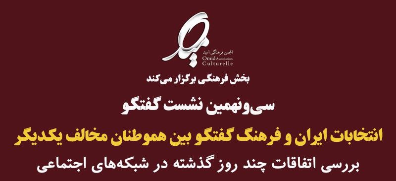 نشست گفتگو با موضوع انتخابات ایران و فرهنگ گفتگو بین هموطنان مخالف همدیگر توسط F A R · منتشر شده 20/05/2017 · بروزرسانی شده 22/05/2017 سی و نهمین نشست گفتگوی انجمن فرهنگی امید به موضوع انتخابات ایران و فرهنگ گفتگو میان هموطنان مخالف همدیگر میپردازد. برای اطلاع دقیق از این برنامه به پوستر خبر مراجعه کنید :
