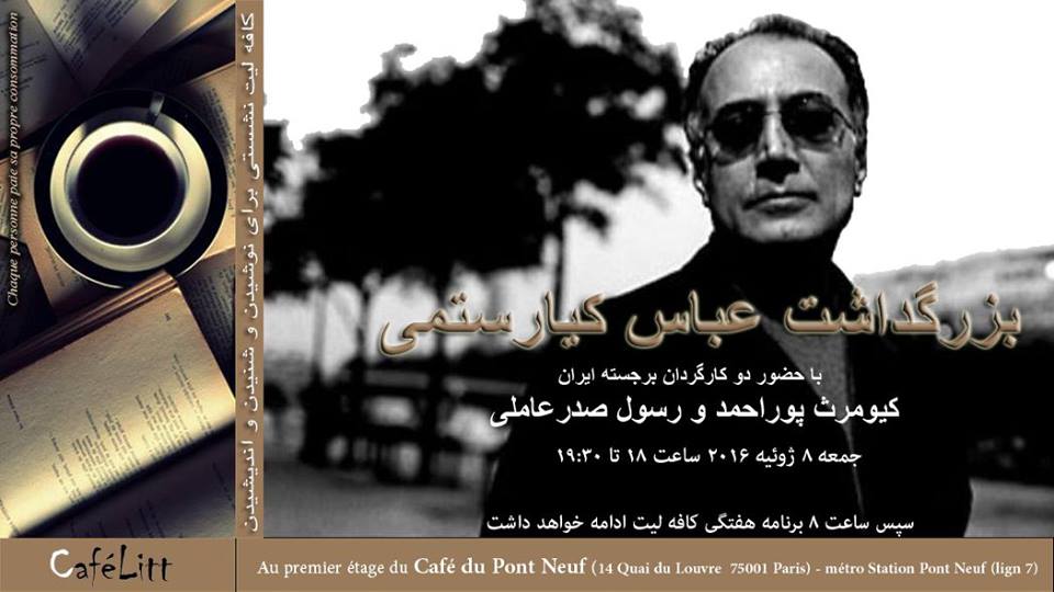 کافه لیت جمعه 8 ژوئیه 2016 ساعت 18:00 تا 19:30 (پیش از برنامه هفتگی خود) مراسم بزرگداشت سینماگر ایرانی، عباس کیارستمی را با حضور دو کارگردان ایرانی، رسول صدرعاملی و کیومرث پوراحمد برگزار خواهد کرد.