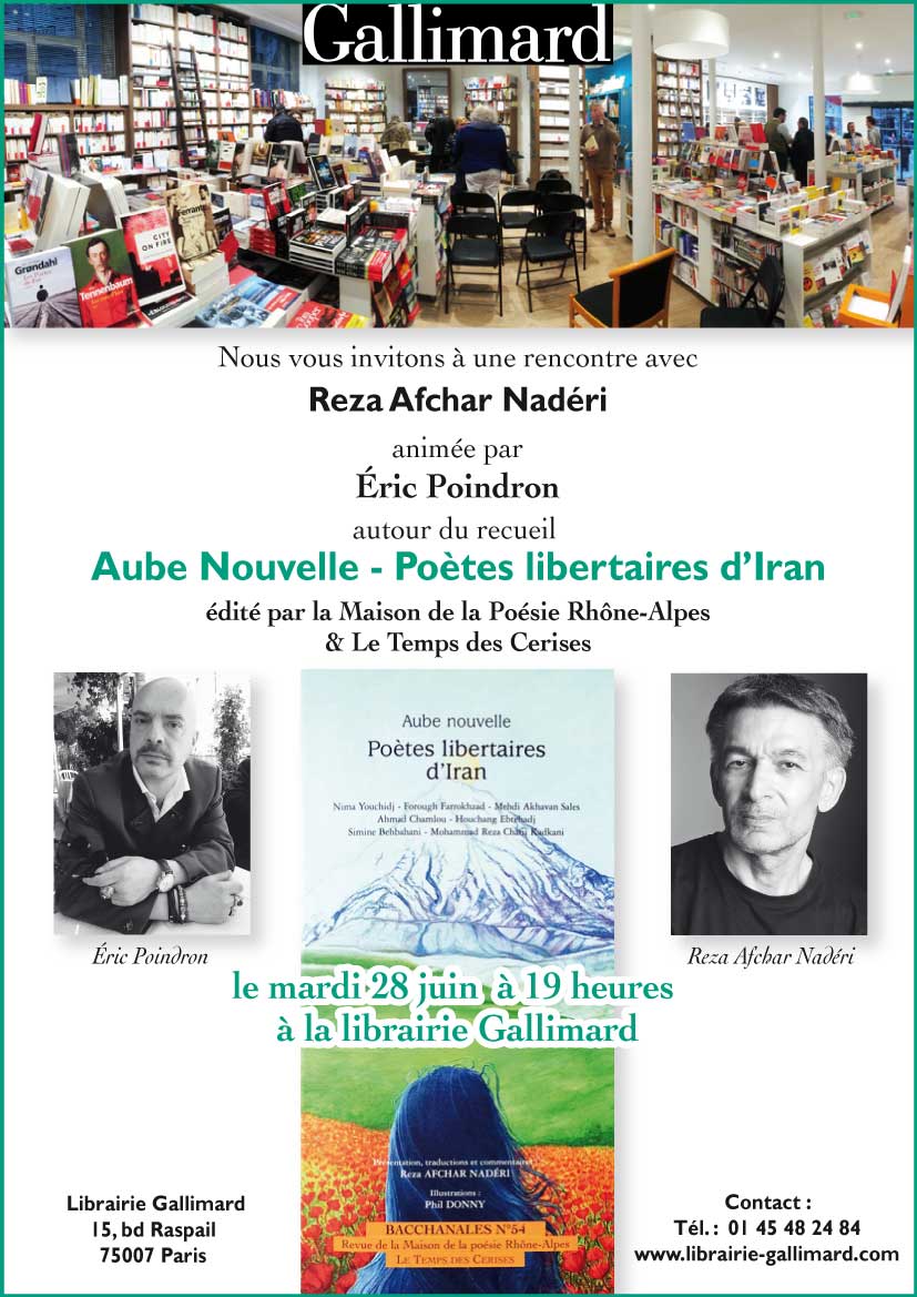 کتاب Aube nouvelle – Poètes libertaires d’Iran (به زبان فارسی : طلوعی نو-شعرای آزادیخواه ایران) آخرین اثر به چاپ رسیده رضا نادر افشاری است. به این مناسبت سه شنبه 28 ژوئن 2016 ساعت 19:00 جلسه معرفی کتاب در کتابفروشی گالیمر برگزار خواهد شد. این کتاب یک مجموعه دو زبانه متشکل از ترجمه های تفسیر شده از هفت شاعر بزرگ معاصر زبان فارسی قرن بیستم است که همچنان در بین مردم ایران می درخشد.