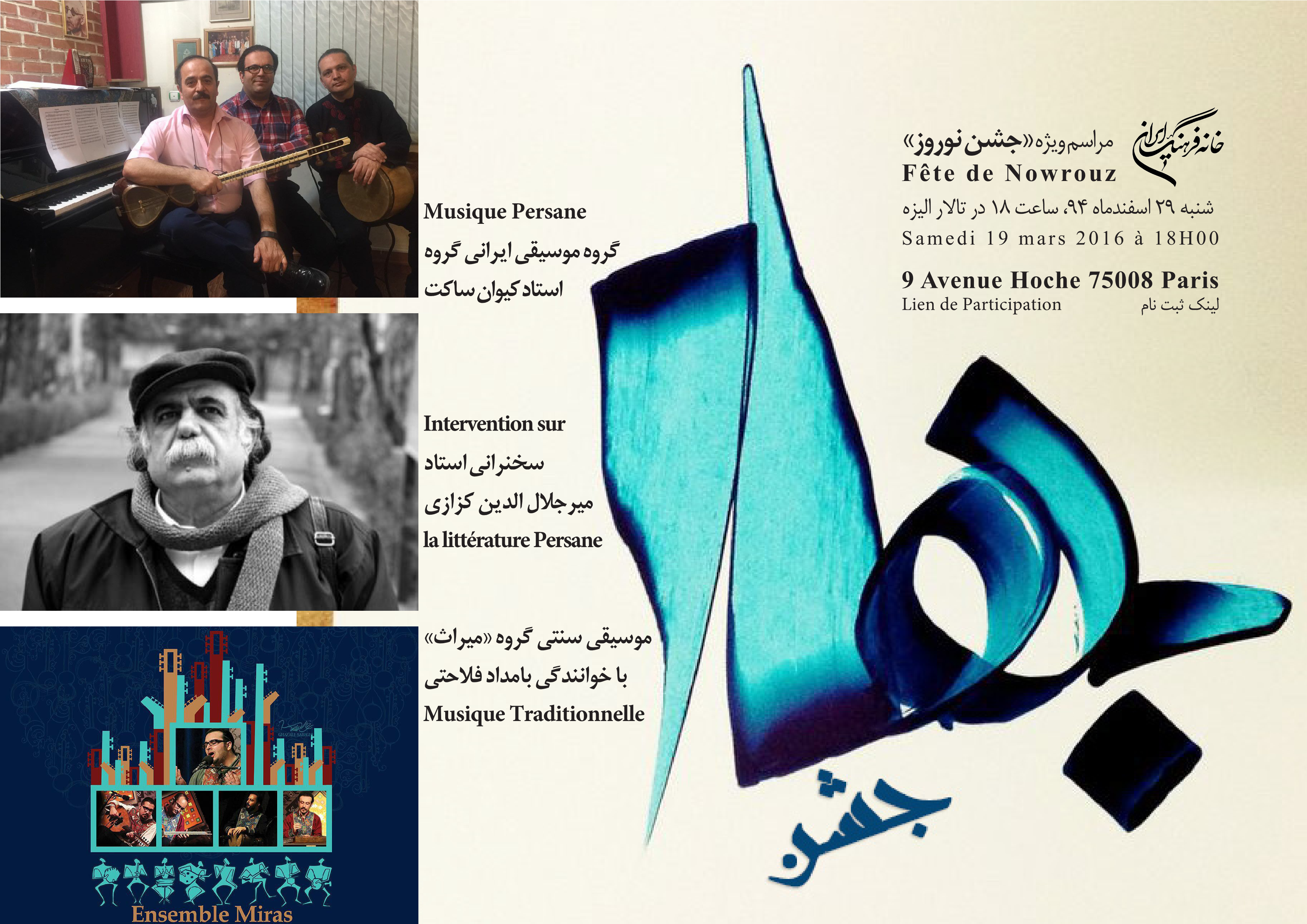 خانه فرهنگ ایران در پاریس جشن ویژه نوروز برگزار میکند. برنامه اجرای موسیقی سنتی و سخنرانی با موضوعات ادبی از جمله برنامههای این مراسم اعلام شده است.