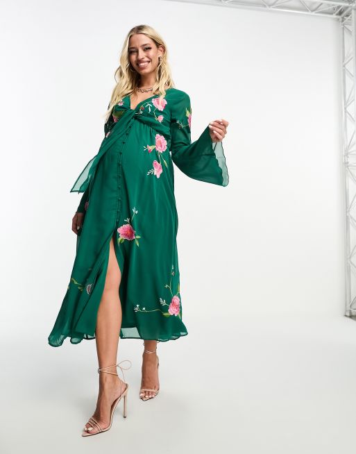 ASOS Design Maternity Midikleid in Waldgrun mit Front Bindung durchgehender Knopfleiste und Blumenstickerei ASOS Very well made.