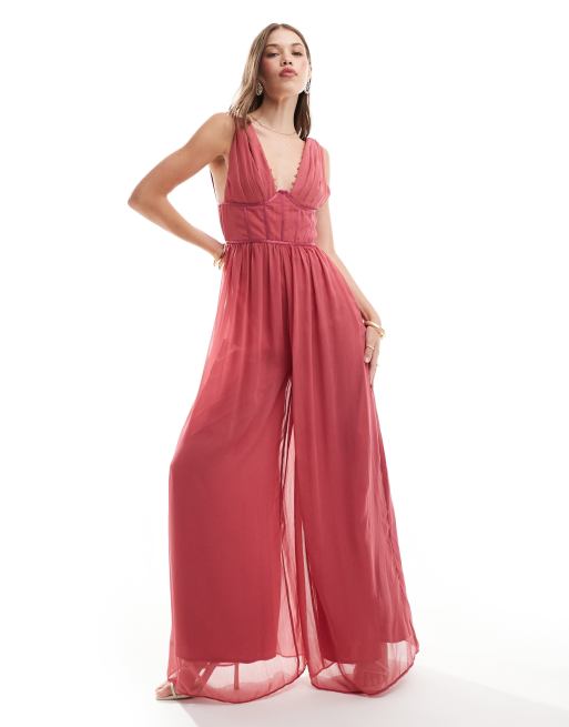 ASOS LUXE Curve Jumpsuit aus Satin in Weinrot mit tiefem Ausschnitt und Ansteckblumen ASOS Very well made.